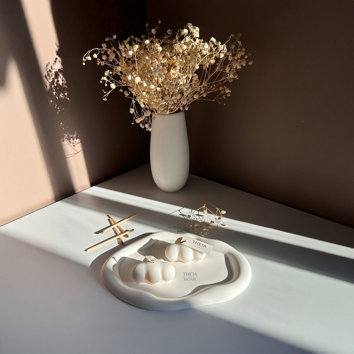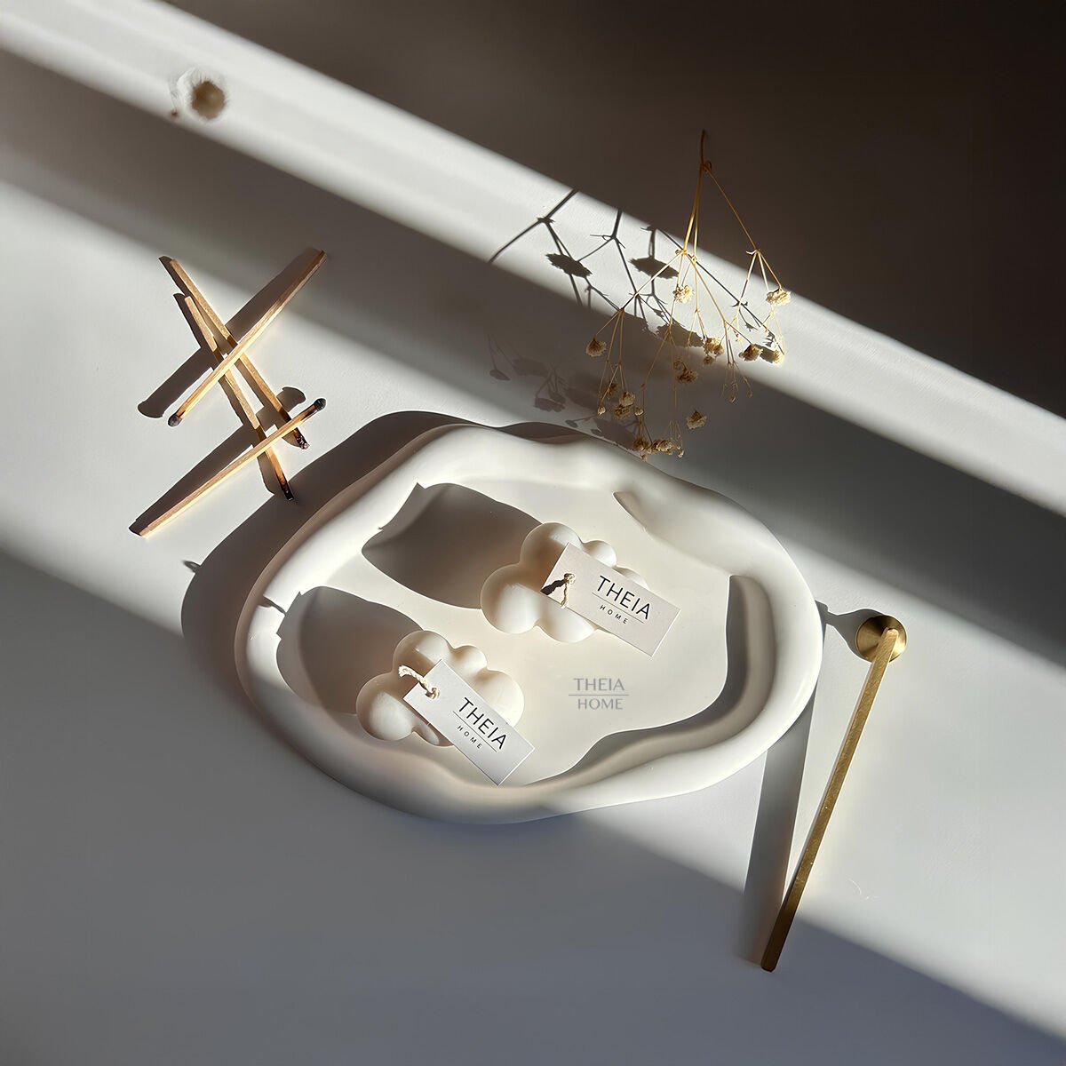 THEIA HOME 3’lü Bulut Dekoratif Tabak ve Vegan Vanilya Mum Seti, minimalist çizgilerle dolu evlere huzur dolu bir atmosfer kazandırır. Hem görsel hem duyusal zenginlik isteyenler için özel bir seçim!