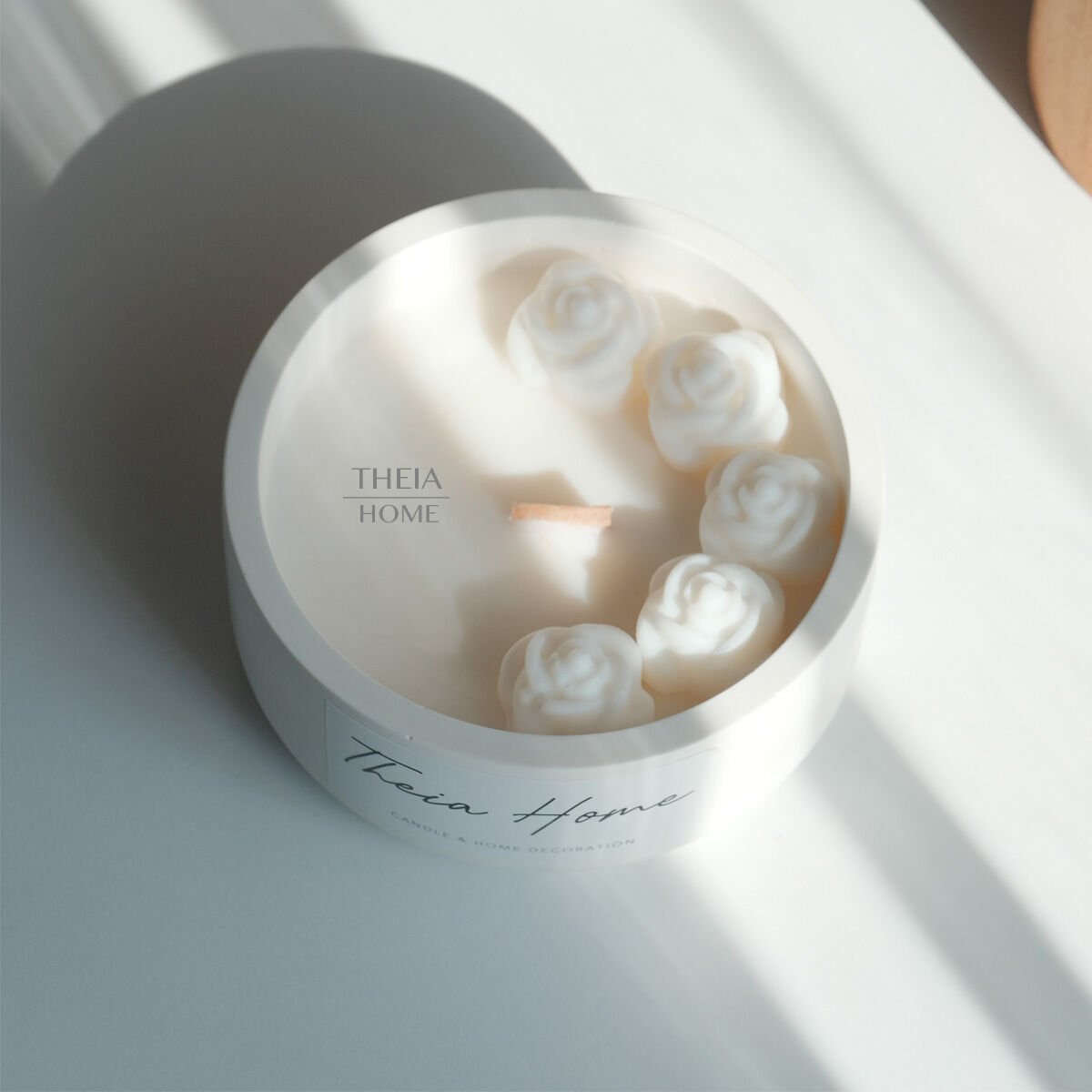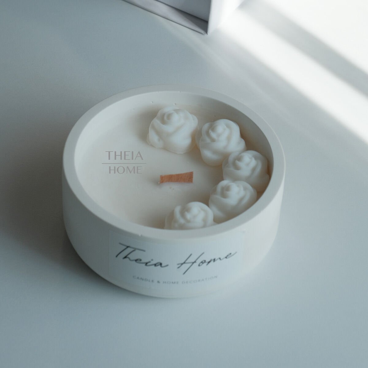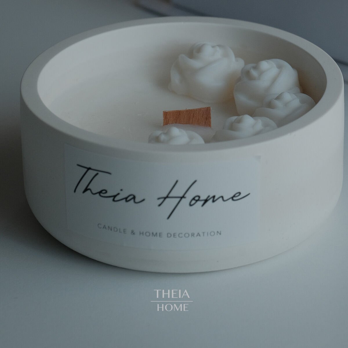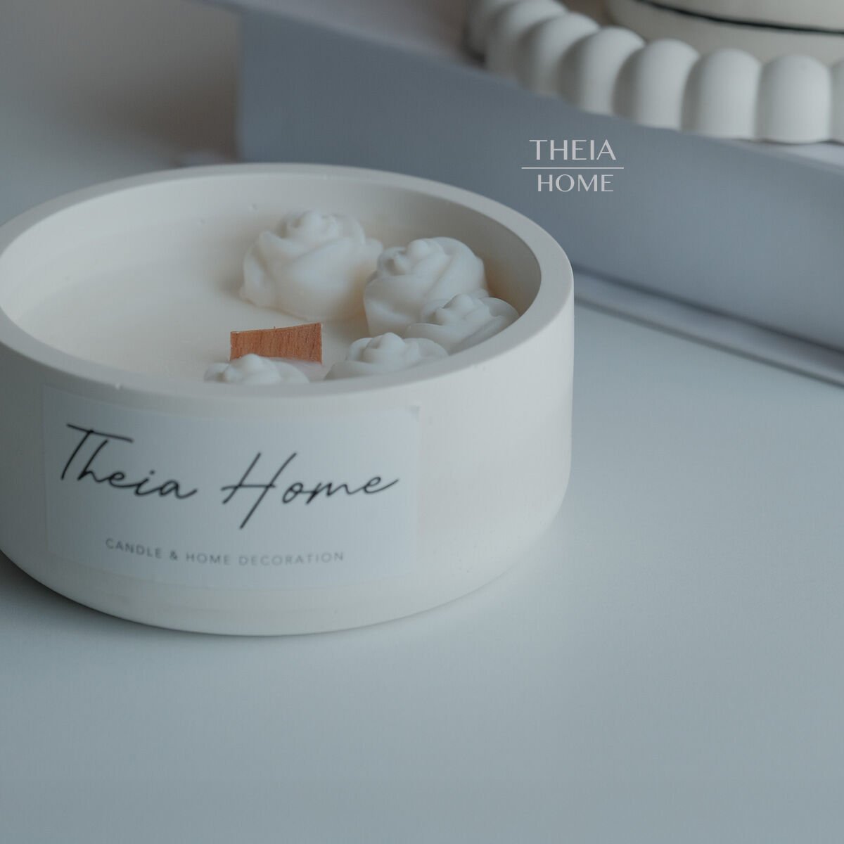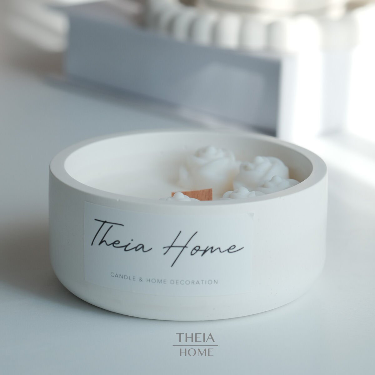 Doğallığın zarafetini beton saksı formuyla buluşturan THEIA HOME Beton Saksıda Çiçek Figürlü Vanilya Kokulu Soya Mum, hem görsel hem duygusal olarak yaşam alanlarınızı zenginleştiriyor.