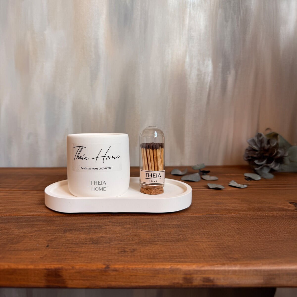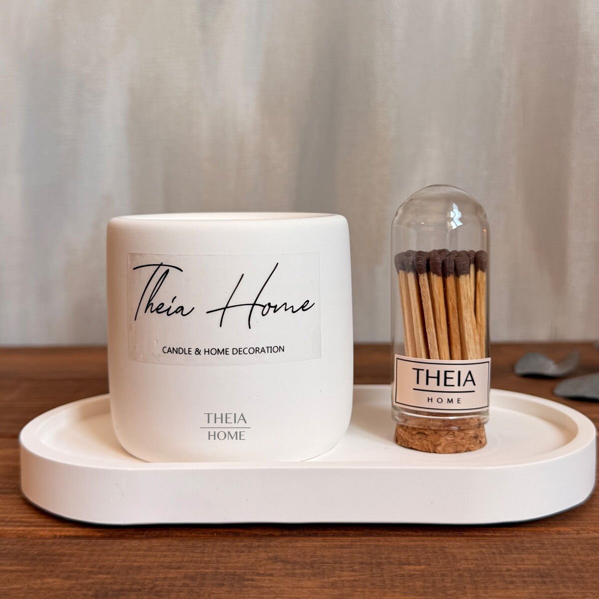 THEIA HOME Beton Saksılı Soya Mum, Oval Tabak ve Kibrit Seti; estetik, fonksiyonellik ve duyusal atmosferi bir arada sunarak hem kendinize hem sevdiklerinize anlamlı ve şık bir hediye seçeneği oluşturur.