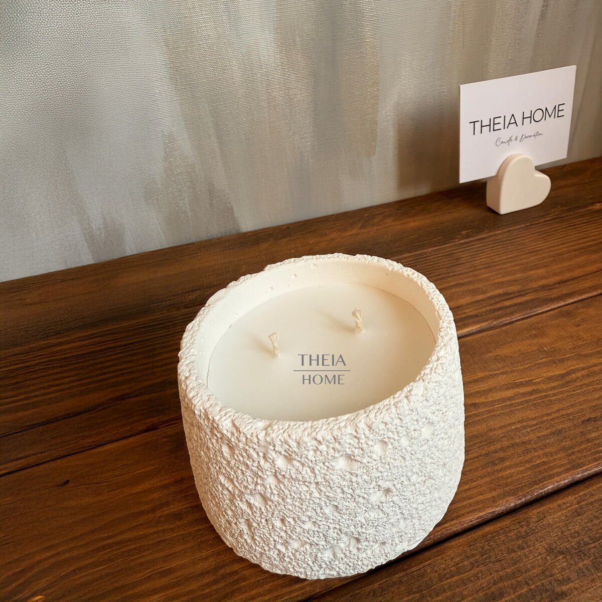 Doğanın dokusunu ve huzur dolu vanilyayı bir arada sunan THEIA HOME Büyük Dokulu Taş Model Soya Mumu, yalın formu ve doğal içeriğiyle evinize dingin bir hava katıyor.