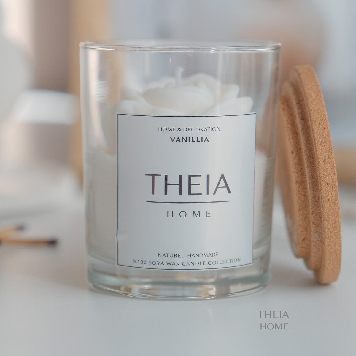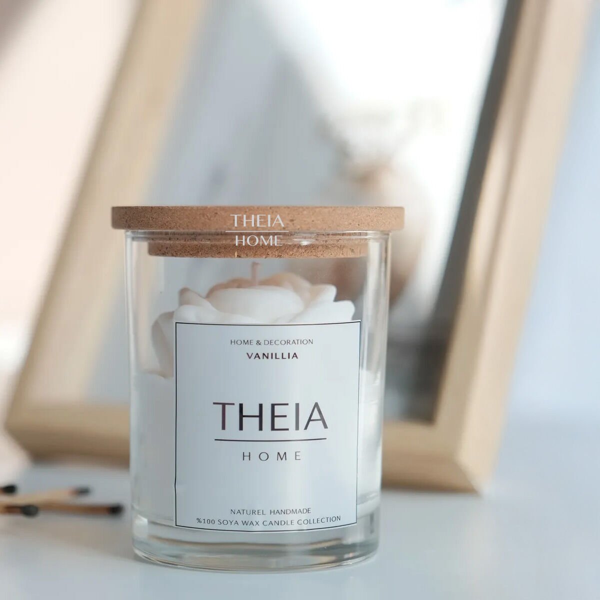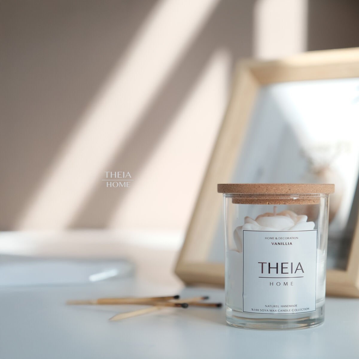 THEIA HOME Vanilya Kokulu Cam Kavanoz Mum, minimalist tasarımı, doğal malzemeleri ve çok yönlü kullanımıyla evinize hem görsel hem de duyusal bir değer katıyor ayrıca hediye olarak da zarif bir seçenek sunuyor.