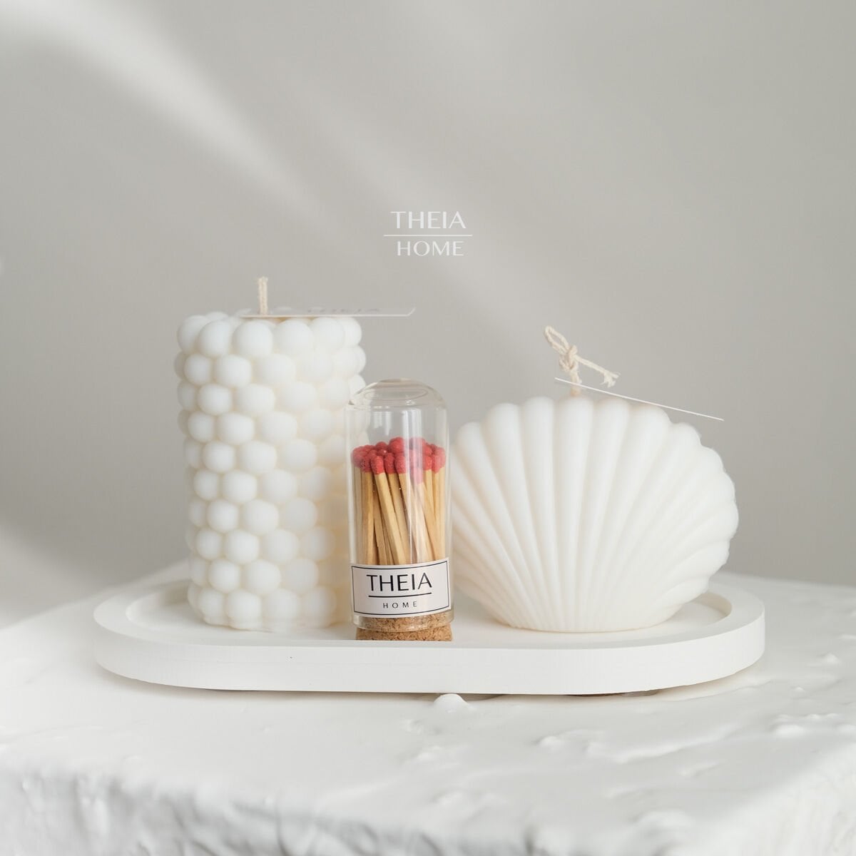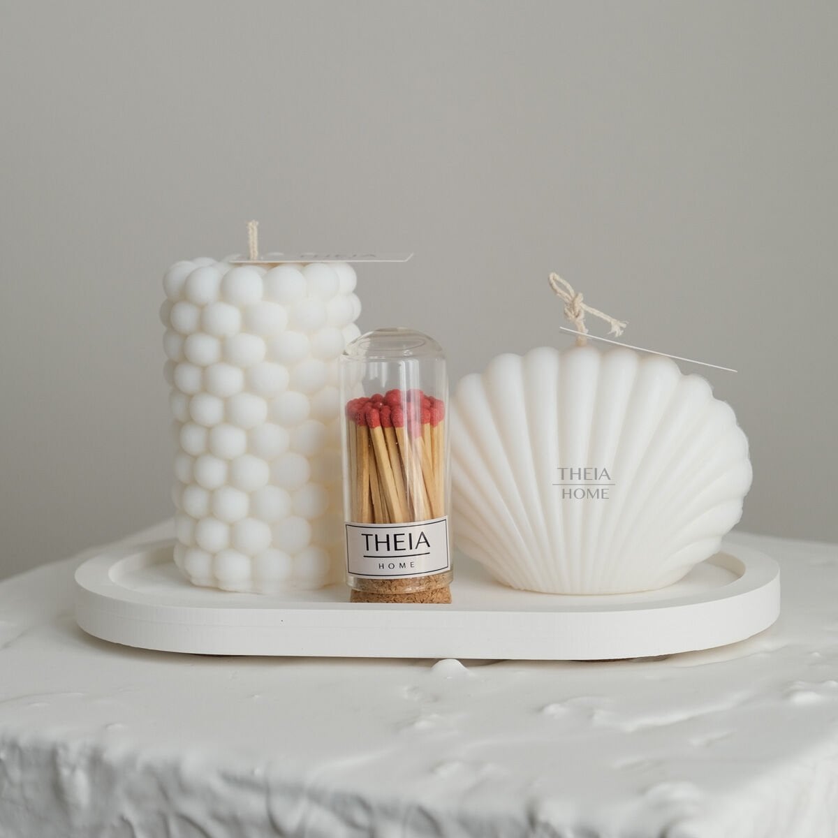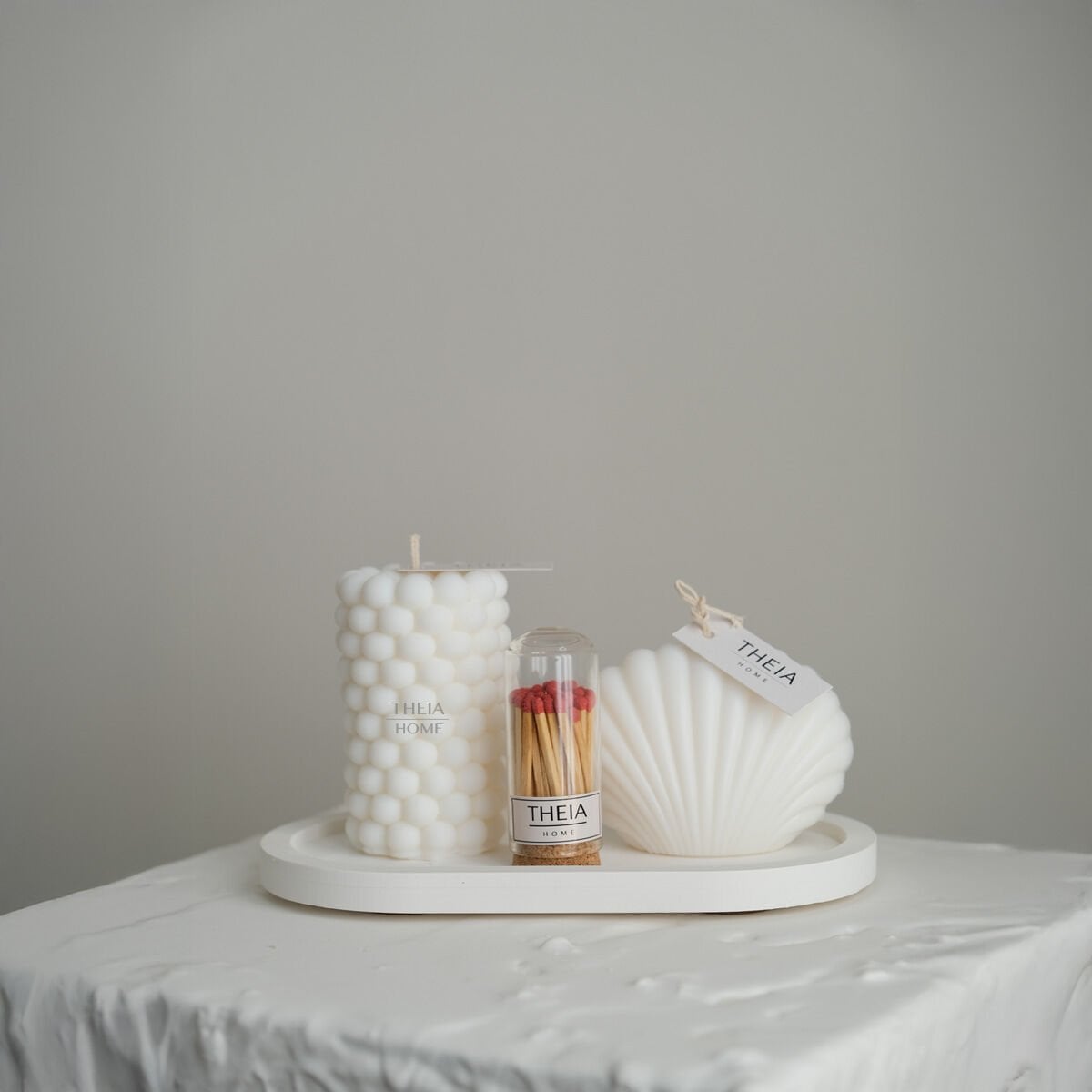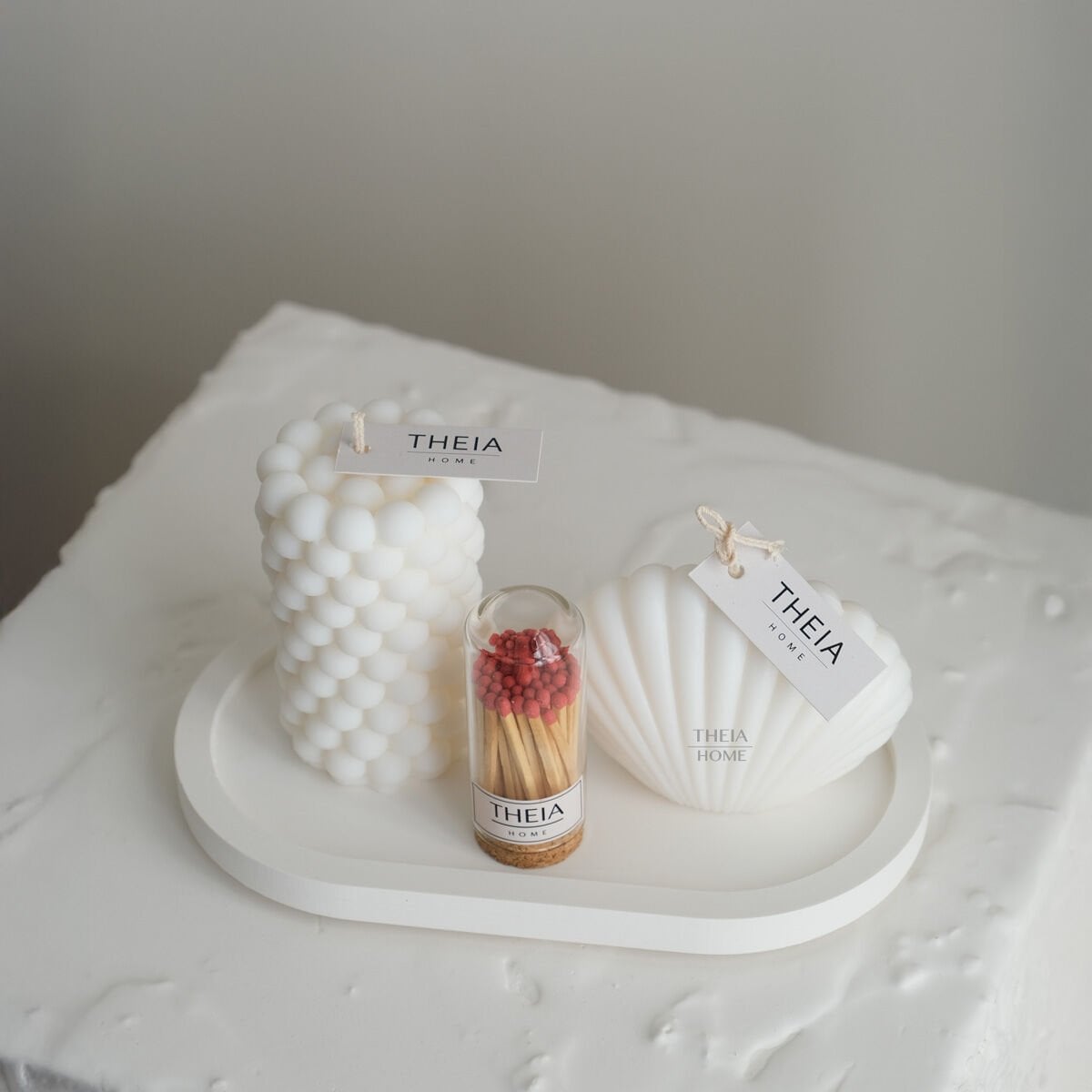 Doğadan ilham alan organik dokusu ve hazır kullanım kolaylığıyla THEIA HOME İstiridye & Bubble Mum, Oval Tabak ve Kibrit 4’lü Set, yaşam alanlarınıza zarif ve huzur dolu bir atmosfer taşıyor.