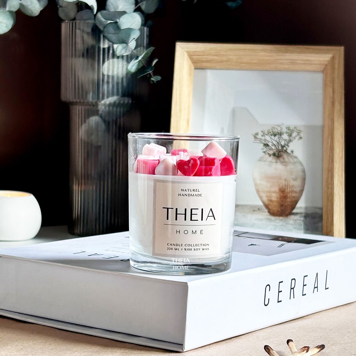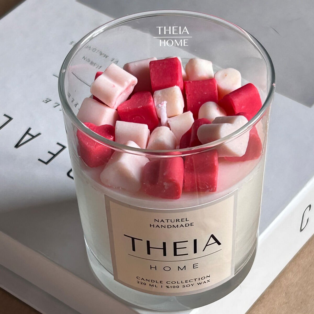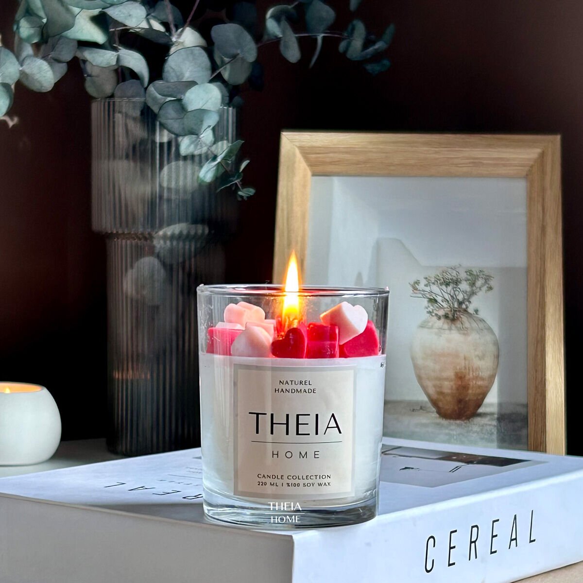 Bu özel tasarım mum, çilek ve vanilya notalarının uyumuyla yaşam alanlarınıza sıcaklık ve romantizm katıyor. Cam kavanoz içerisindeki kalp şeklindeki detaylar, estetik bir görünüm sunarken, doğal soya mumu içeriğiyle sağlıklı bir kullanım sağlıyor.