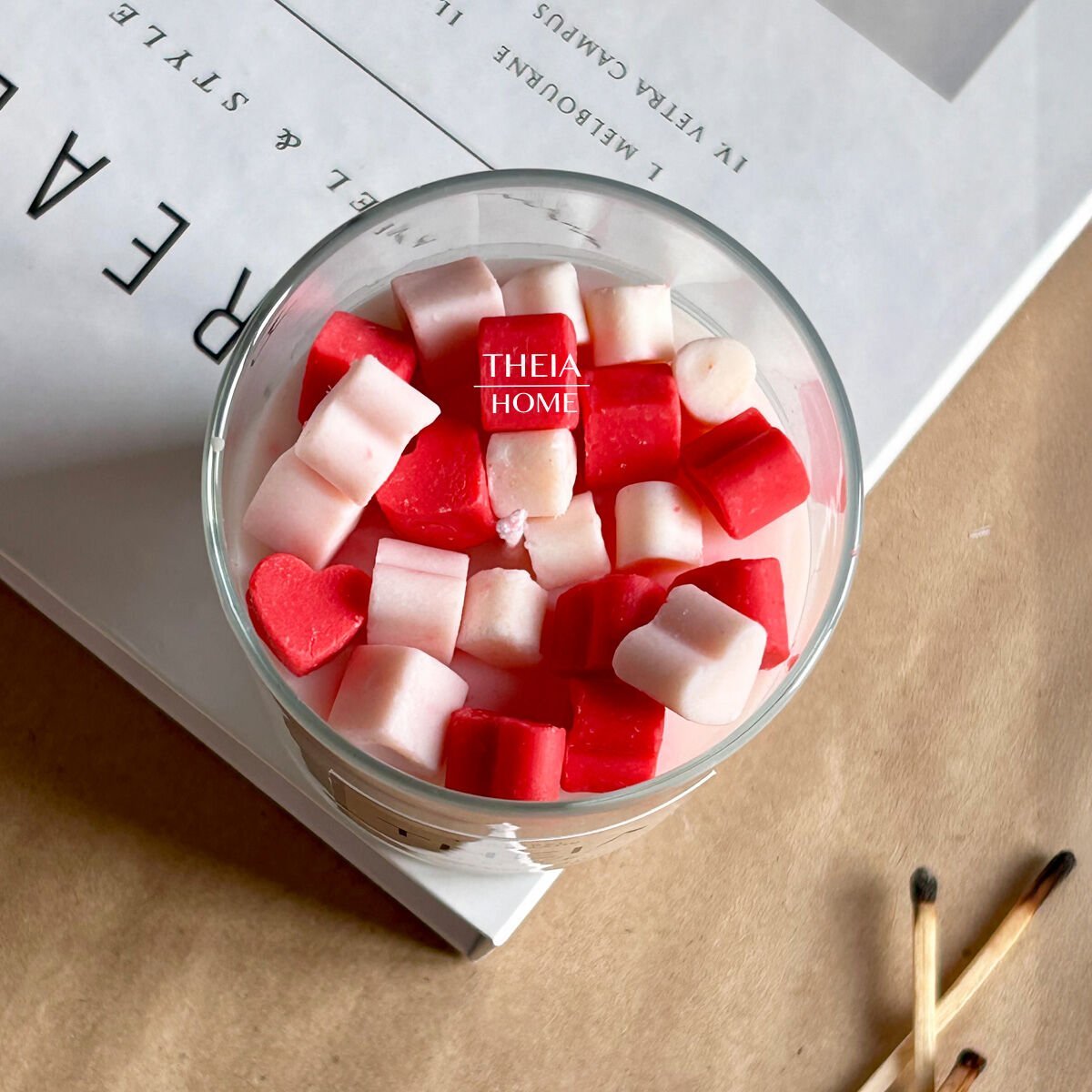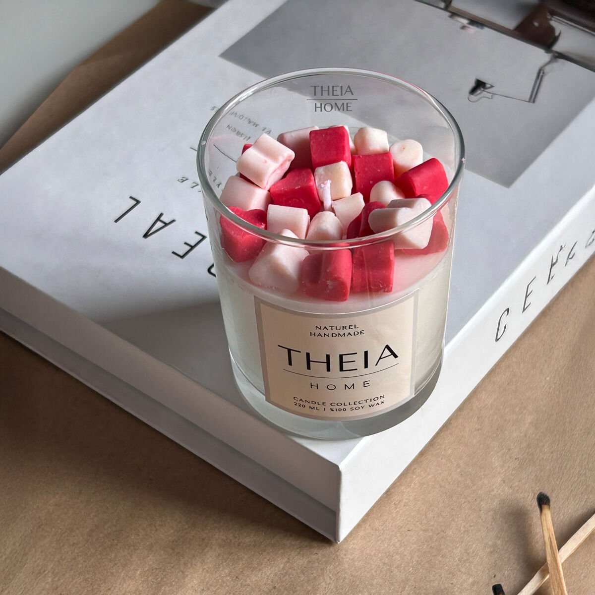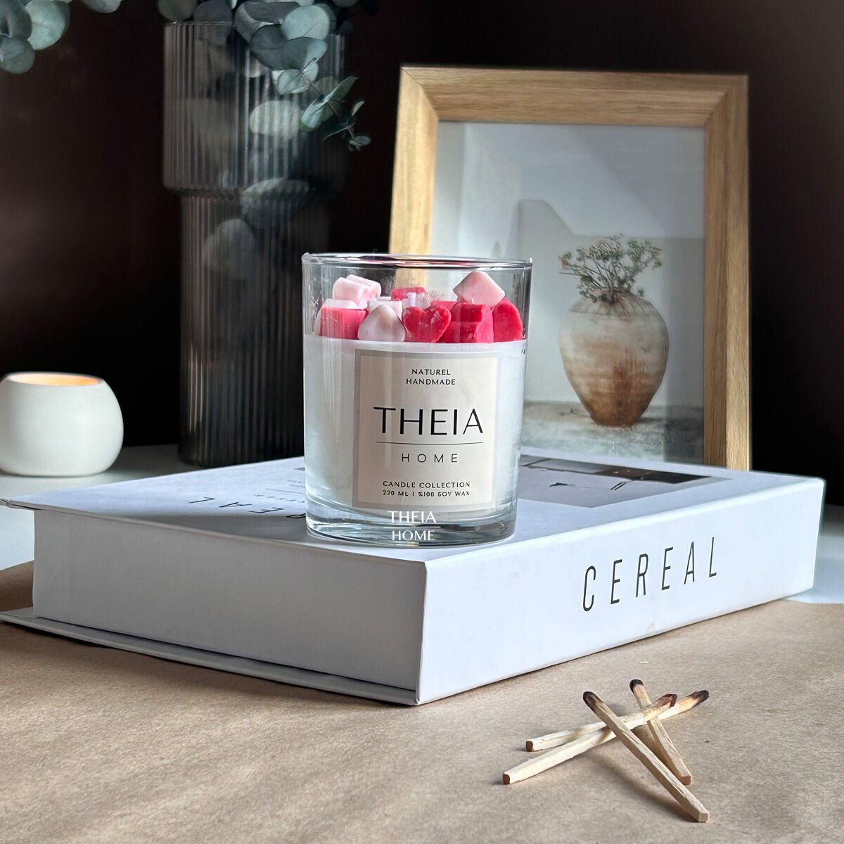 Bu özel tasarım mum, çilek ve vanilya notalarının uyumuyla yaşam alanlarınıza sıcaklık ve romantizm katıyor. Cam kavanoz içerisindeki kalp şeklindeki detaylar, estetik bir görünüm sunarken, doğal soya mumu içeriğiyle sağlıklı bir kullanım sağlıyor.