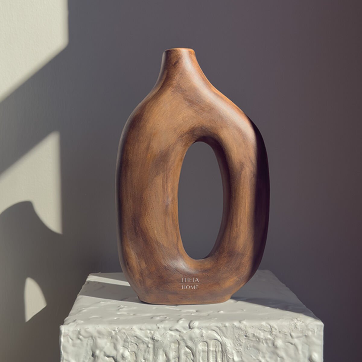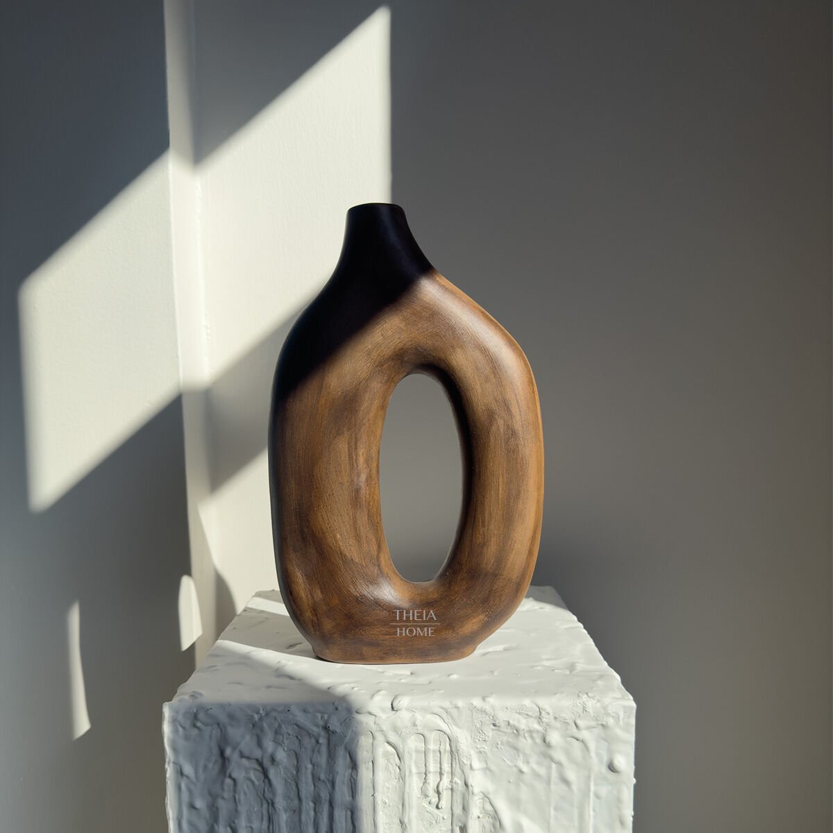 THEIA HOME Seramik Ahşap Görünümlü Modern Oval Geçit Vazo; hem modern sanatın estetiğini hem de doğal malzeme hissini yaşam alanlarınıza taşır. Göz alıcı ve ilham verici bir atmosfer yaratmak için idealdir.