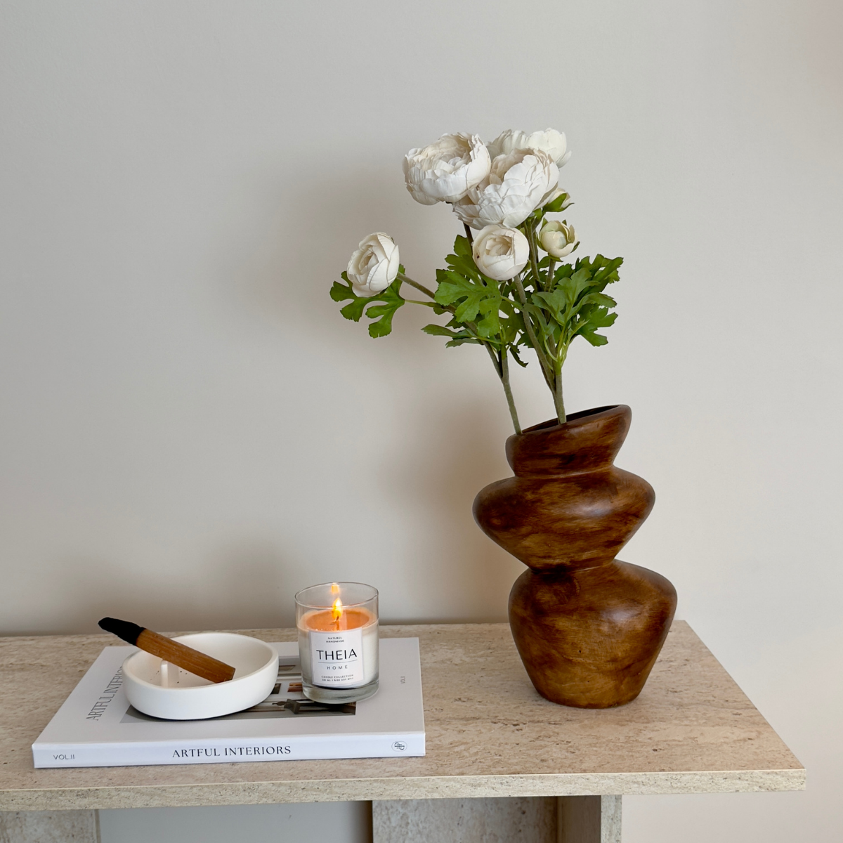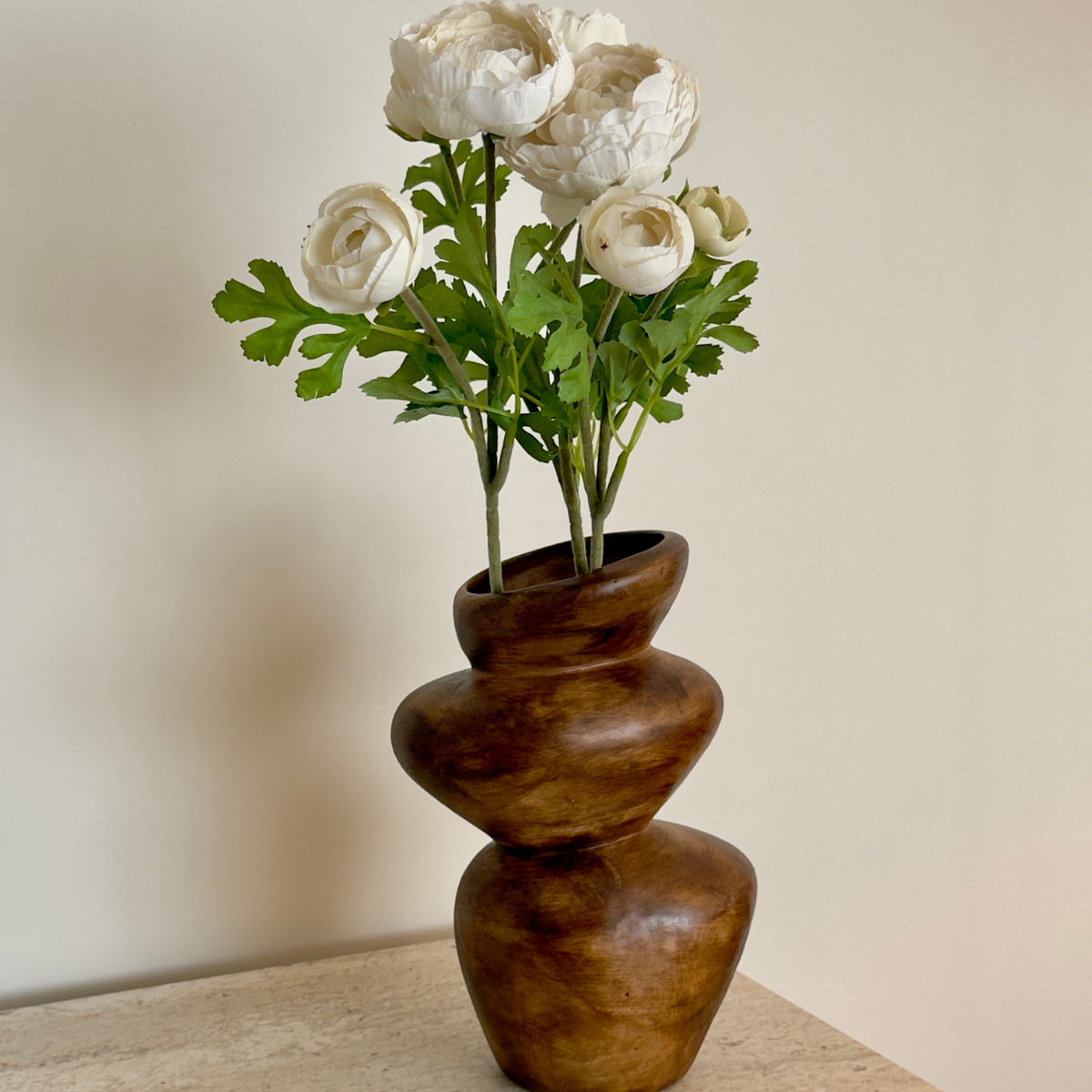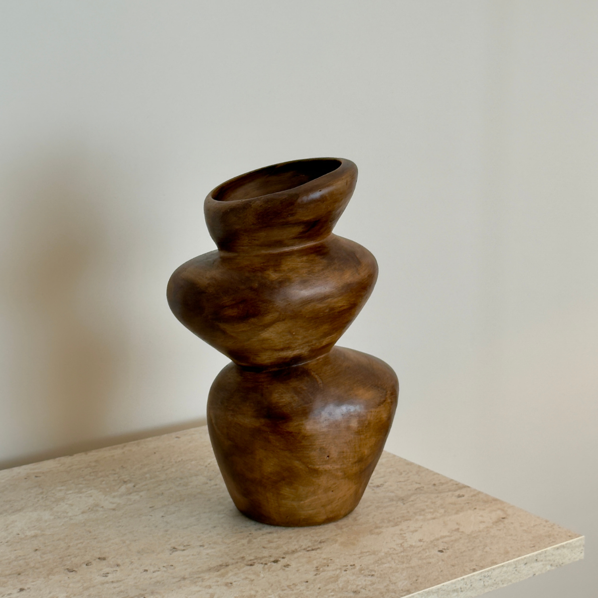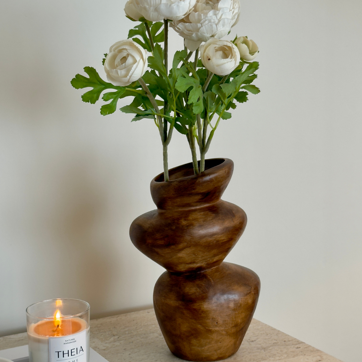 Asimetrik formu ve ahşap görünümlü yüzeyiyle öne çıkan bu seramik vazo, mekâna doğal ve heykelsi bir etki kazandırır. Akışkan hatları sayesinde tek başına güçlü bir dekoratif duruş sergilerken, kuru çiçek ve doğal aranjmanlarla birlikte kullanıldığında dengeli ve zamansız bir görünüm sunar. Modern, doğal ve minimalist dekorasyon stilleriyle uyum sağlar.