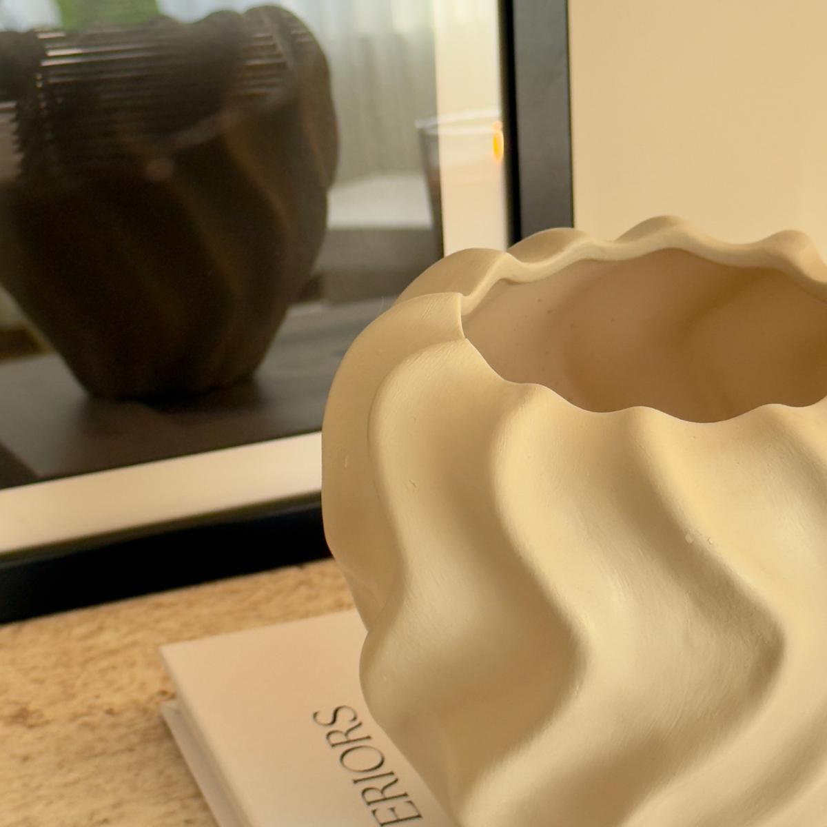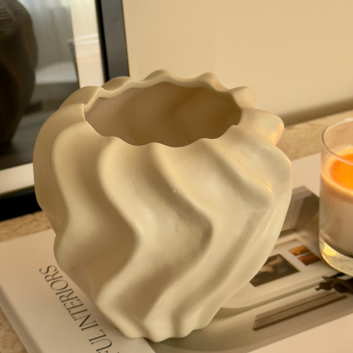 Burgu formundan ilham alan bej renk seramik vazo, sade tonu ve akışkan formuyla mekâna zarif bir denge kazandırır. Kompakt ölçüsü sayesinde küçük alanlarda tek başına güçlü bir dekoratif vurgu oluşturur. Minimal, modern ve doğal dekorasyon stilleriyle uyum sağlar.