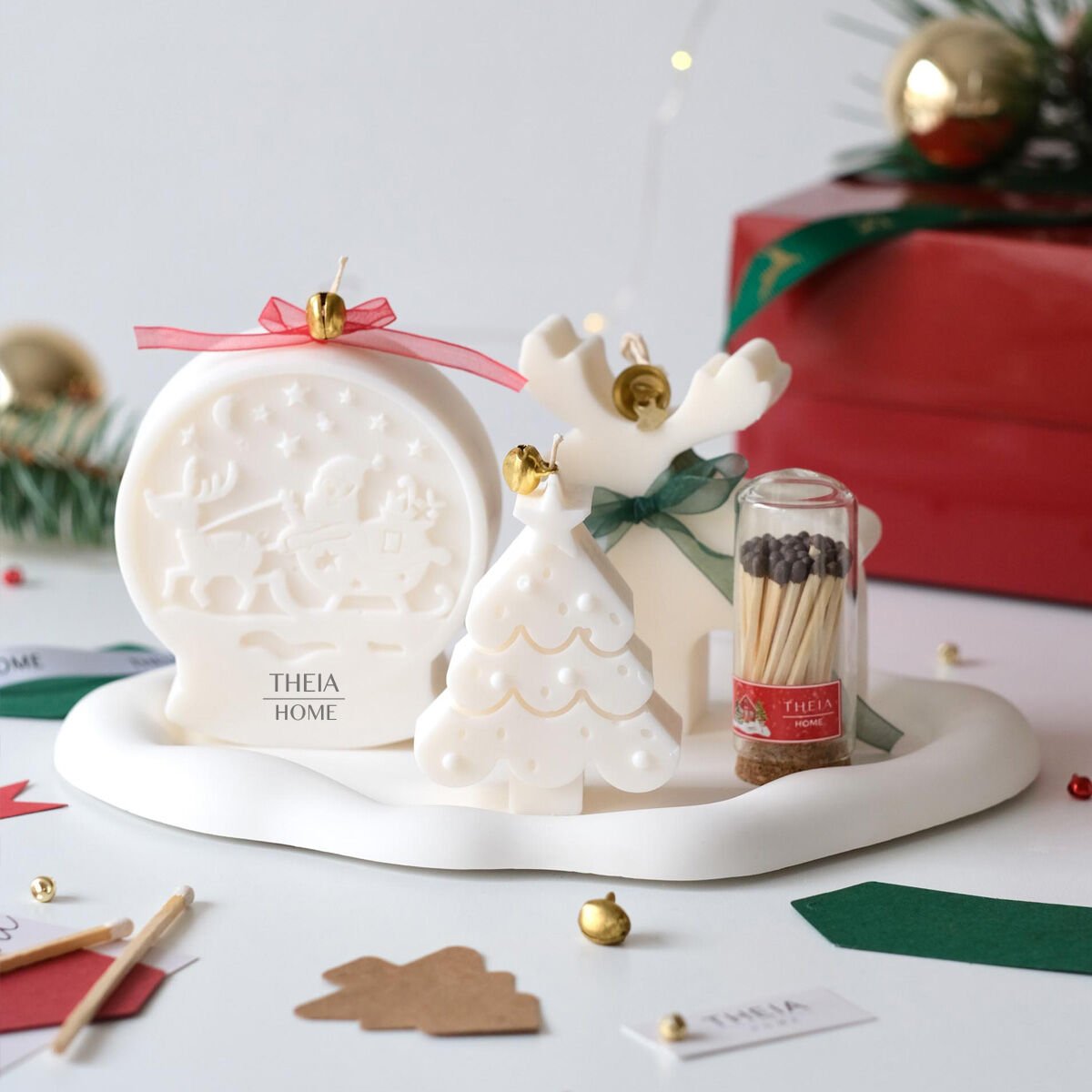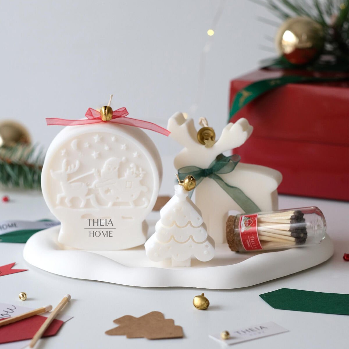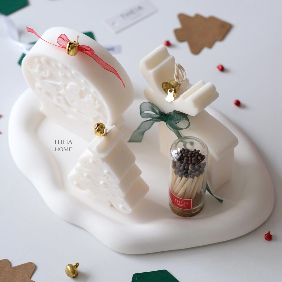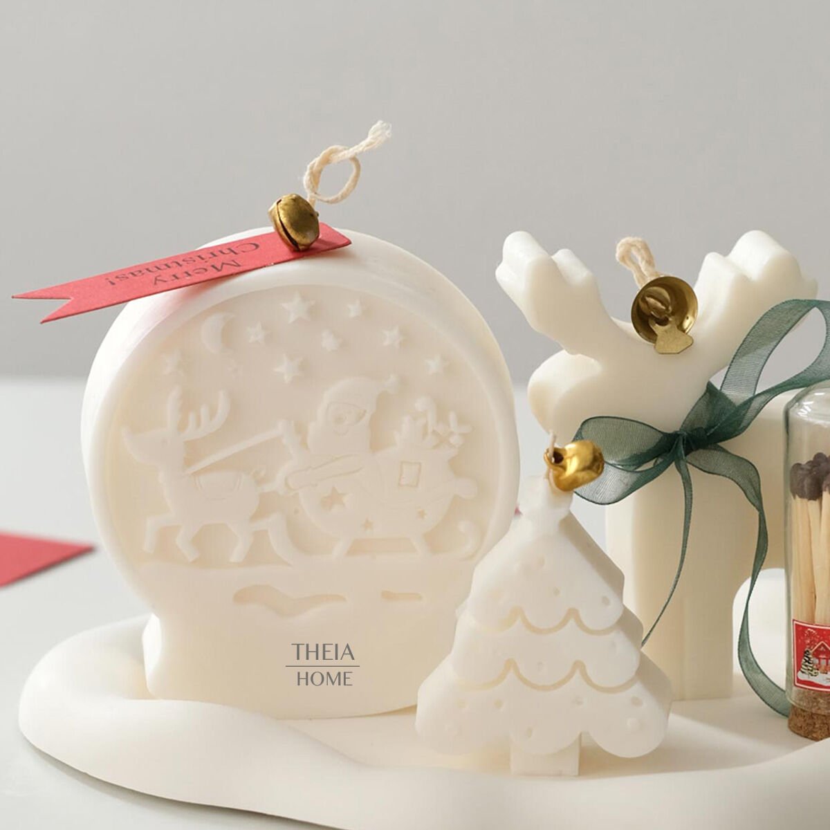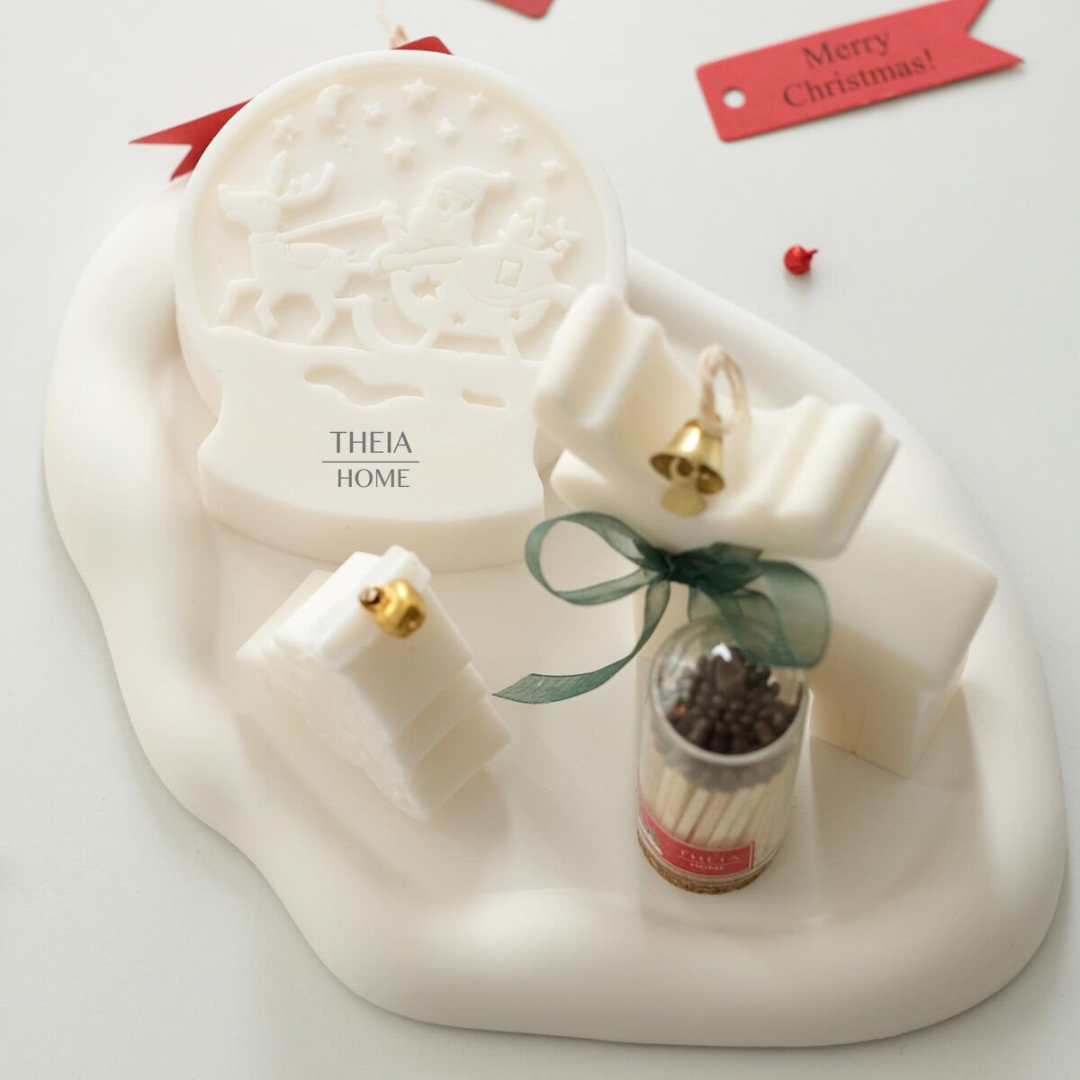 Yılbaşı ruhunu zarif ve sade bir formda yansıtan bu özel set, Theia Home’un el yapımı koleksiyonunun en sevilen parçalarından biridir. Her biri farklı figürlerle tasarlanan dekoratif mumlar, yeni yılın sıcak enerjisini minimalist bir estetikle buluşturur. Kızak, çam ağacı ve geyik detaylarıyla tamamlanan bu set; saf beyaz tonları ve yumuşak hatlarıyla bulunduğu her alana huzurlu bir atmosfer kazandırır.