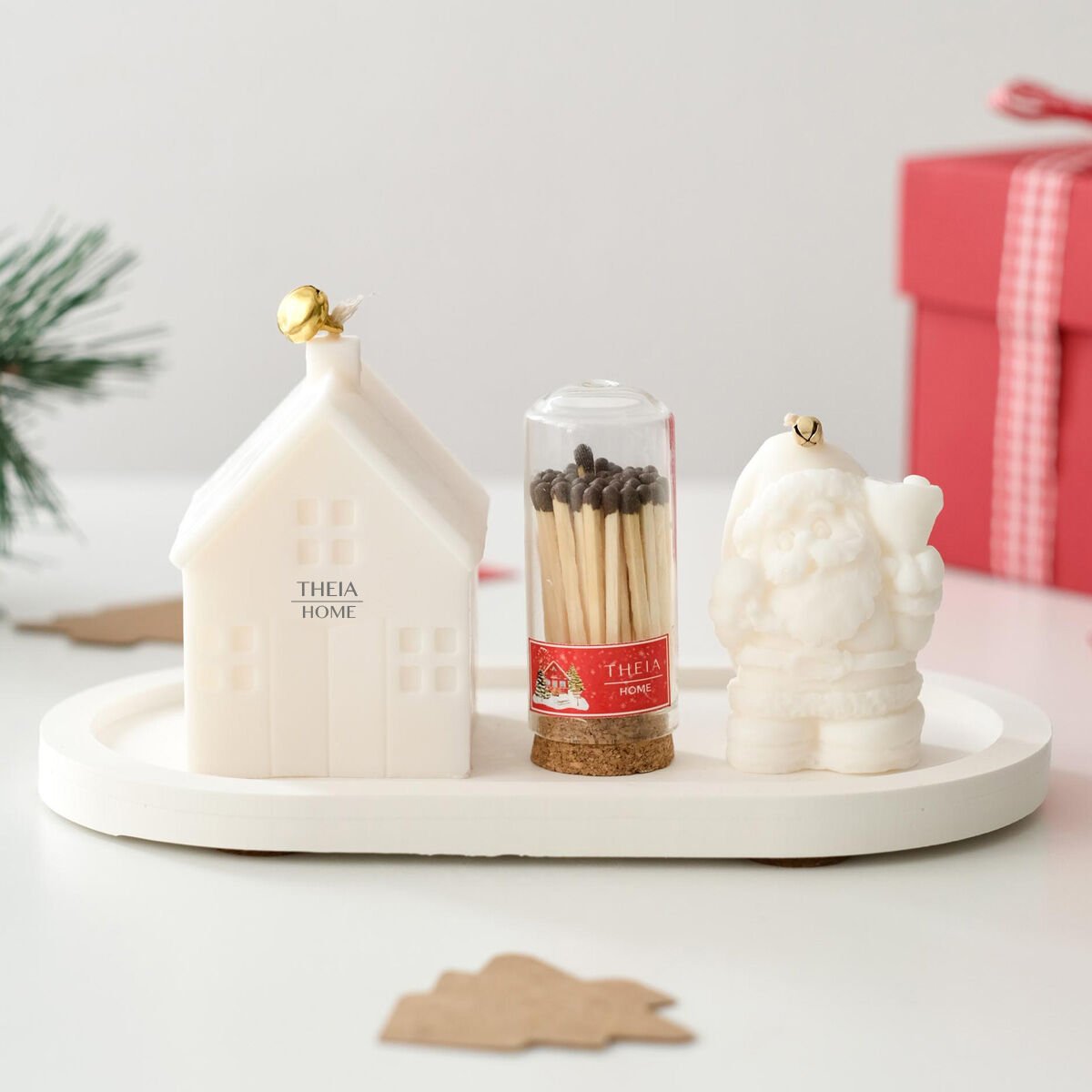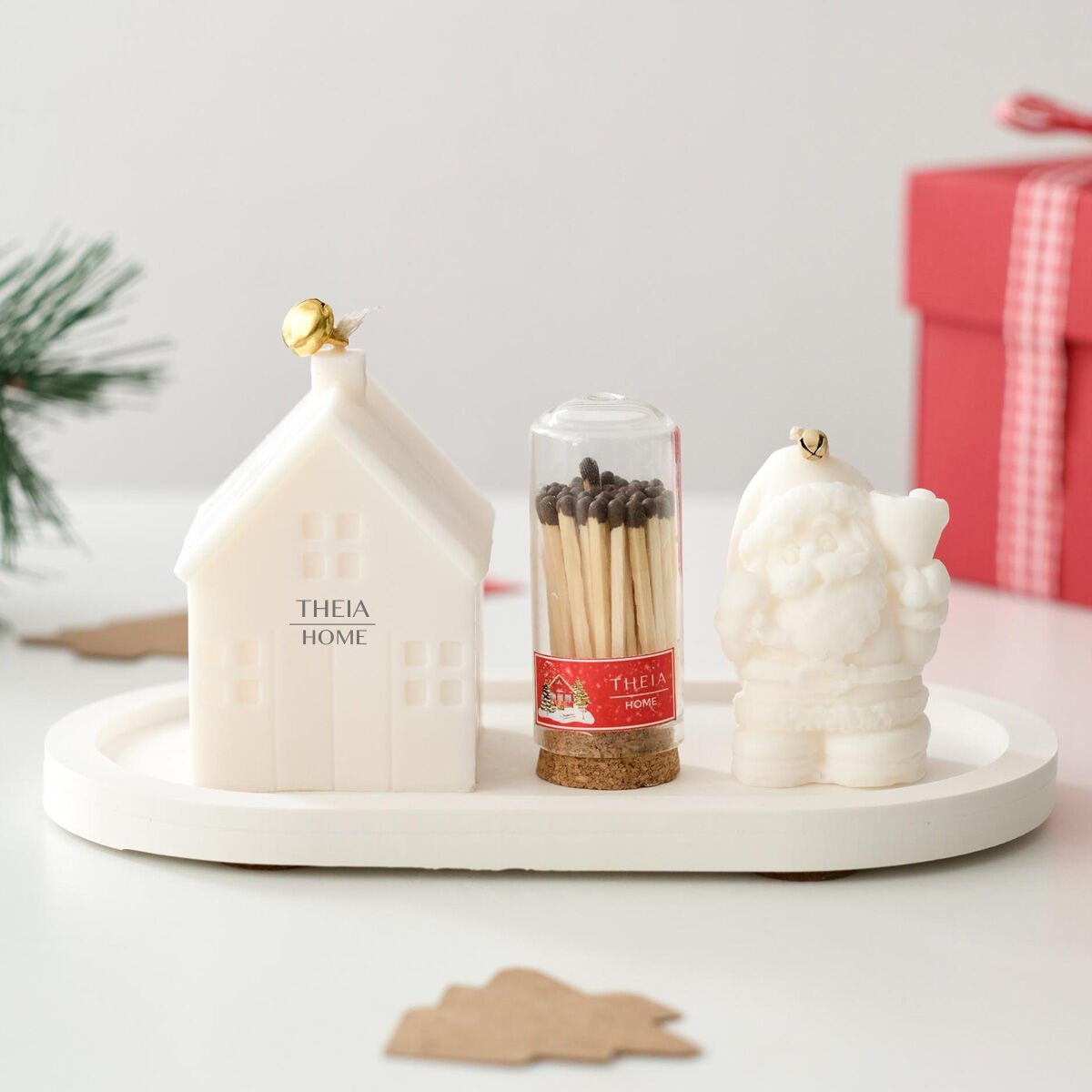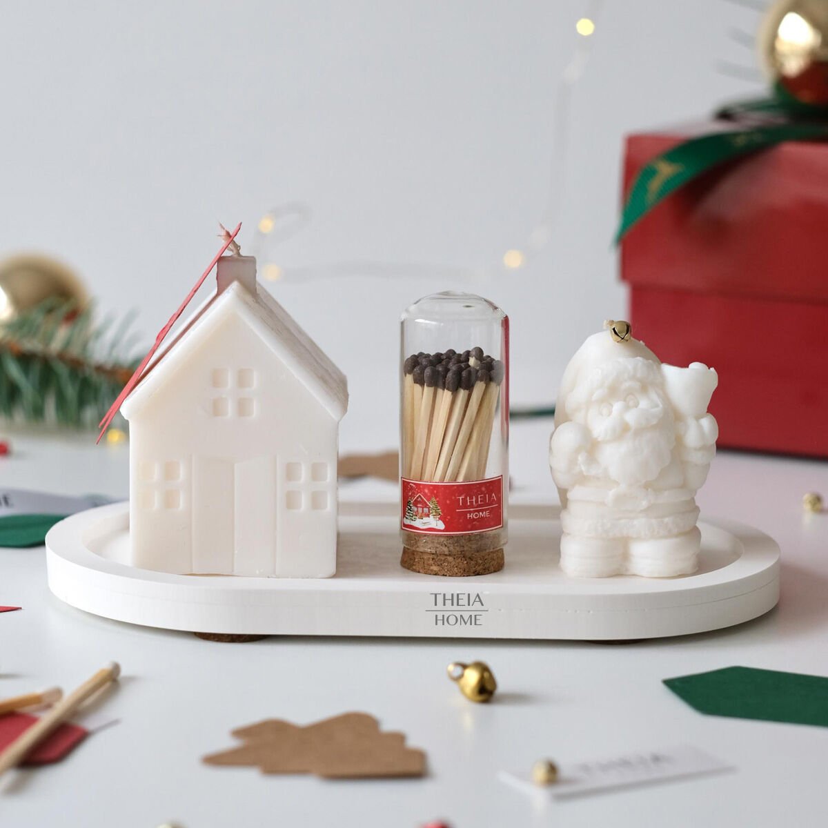 Theia Home’un yılbaşı koleksiyonunun en sade ama en dikkat çekici parçalarından biri olan bu set, el işçiliğiyle üretilmiş figürlerin zarif bir uyumunu taşır. Küçük ev ve noel baba figürlü dekoratif mumlar, soft beyaz tonlarıyla sıcak bir atmosfer yaratır. Cam fanusta yer alan yılbaşı etiketli kibrit, detaylarda bile estetik bütünlüğü korur.